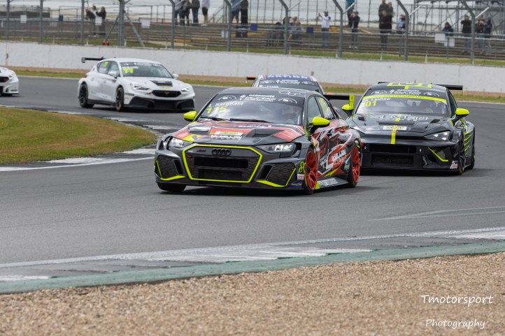 Initially Newsham came under pressure from Sargeant, but a slight lock up into Brooklands allowed the Hyundai driver to break the assault leaving Sergeant to come under attack from Sam Laidlaw with the Audi and Cupra VZ going to war for the first half of the race.